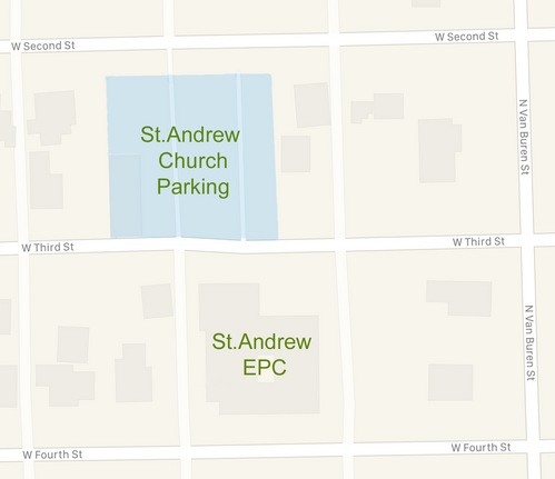 There is a spacious parking lot behind the church building, between West 2nd and 3rd Streets.